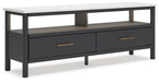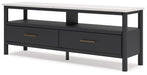 Imagine a TV stand that adds sophisticated and minimal boho style to your home with a stylish storage solution. This stand does just that. Its sleek design and replicated marble top create an upscale ambiance that's perfect for displaying your television and organizing your space.