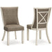 The beauty of this upholstered dining chair is something to savor. Contoured seat cradles you in cushioned comfort while lattice peekaboo detail on the back makes this a striking chair from all angles. Heavy woven fabric adds textural interest that complements the chair’s antiqued white finish.