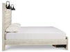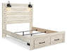 What a delightful take on rustic industrial style. Whether modern loft or modern farmhouse, this queen panel storage bed makes itself at home. The wispy whitewash palette enhances without covering the grain for that weathered look you crave. Love to read in bed? You’re sure to find the retro-chic light sconces and USB plug-ins on the open-slat style headboard such a bright idea. Elongated metal drawer pulls on the footboard storage drawers elevate the aesthetic.