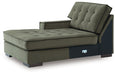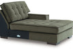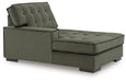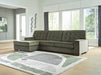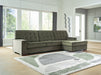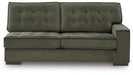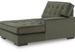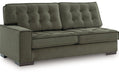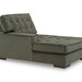 This sleek sectional with chaise offers a highly contemporary look with plenty of space to spread out. Dramatic tufted detailing and luxurious upholstery in a rich olive color create a sophisticated atmosphere. This sectional is perfect for those who love to entertain, or simply relax, in uptown style and comfort.